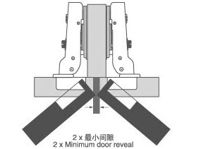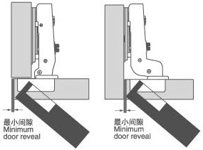 最小間隙指?jìng)?cè)面應(yīng)該預(yù)留的空間,以確保門(mén)的正常開(kāi)啟。它取決于杯座距離K,門(mén)的厚度和所選擇的鉸鏈類(lèi)型。門(mén)上的圓角,可以減小最小間隙。每種較鏈的最小間隙,詳見(jiàn)表格。